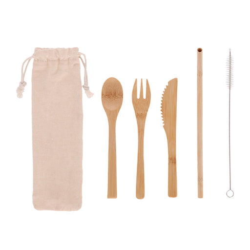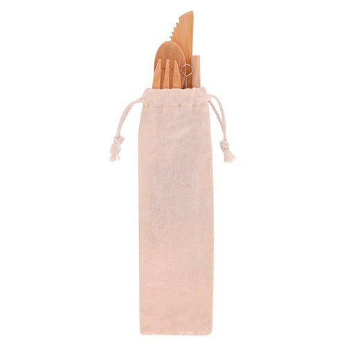 Descripción y características Set de cubiertos de bambú. Incluye tenedor, cuchara, cuchillo, popote, cepillo limpiador y bolsa con jareta. Informac...