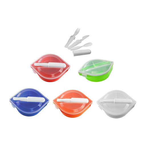 Descripción y características Contenedor de alimentos con doble compartimento. Capacidad total de 1 litro. Incluye tenedor, cuchillo y cuchara. Su ...