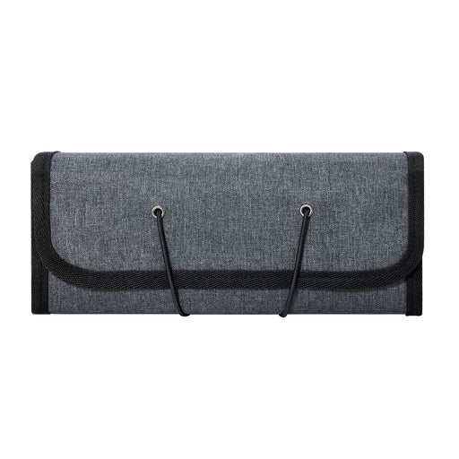 Description and characteristics Roll-up accessory organizer. Contains two zippered mesh compartments, a middle compartment with elastic bands, a...