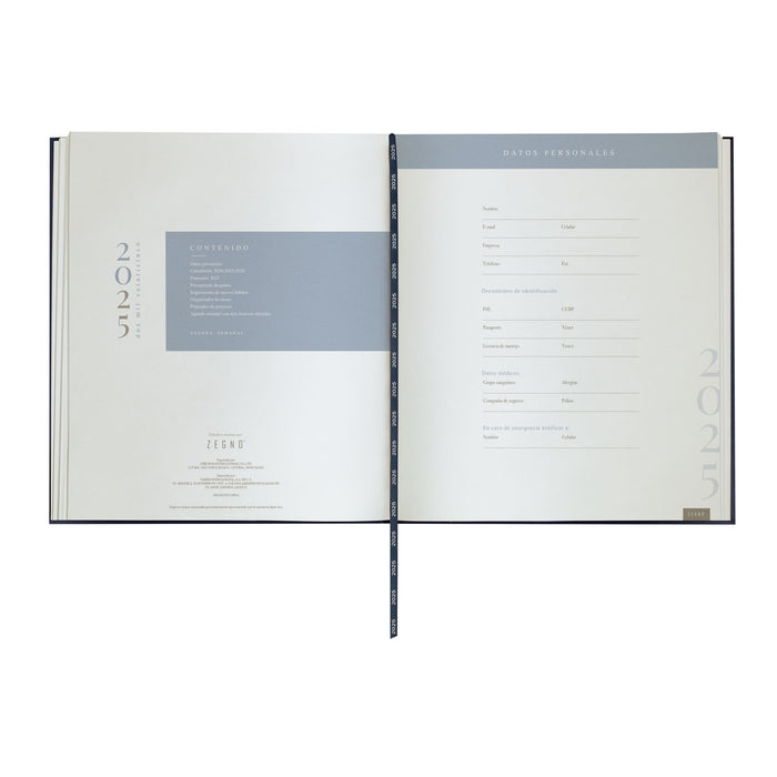 Weekly planner with 80 pages. Contains personal information, a 2024-2025-2026 calendar, a 2025 planner, a spending budget, a new habit tracker, a task organizer, a project planner, and holiday planner. Includes an individual box.