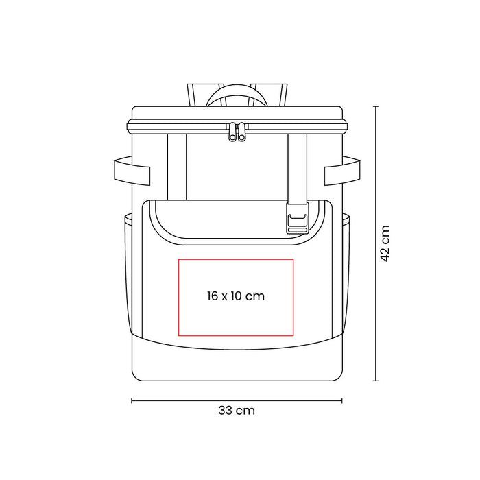 Backpack-style cooler with a waterproof laminated interior. Spacious main compartment with zipper and interior mesh pocket, front pocket with Velcro closure, and two side mesh pockets. It features two side handles and a top handle for easy carrying. The front includes a metal bottle opener and two straps for hanging keys or accessories. The back features adjustable backpack straps with a reflective strip and a padded back for added comfort. Ideal for hiking, beach, fishing, trekking, or road trips. Holds 24 cans.