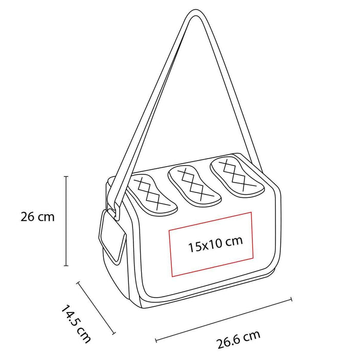 Plastic-coated interior. Main pocket with Velcro closure. Removable internal compartment for 6 bottles. Side pocket. Includes metal bottle opener and adjustable strap.