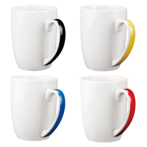 Description and characteristics White ceramic mug with a colored handle. Sold in a sealed box of 36 pieces. Basic Information Category: DRIN...