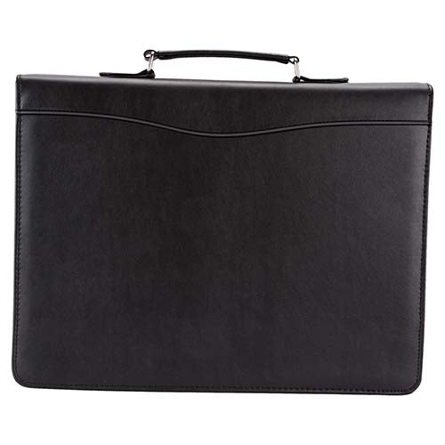 A4-sized lined padfolio with 20 sheets. Includes a pen, card, and passport compartment. 1.25-inch ring binder. Pen not included.