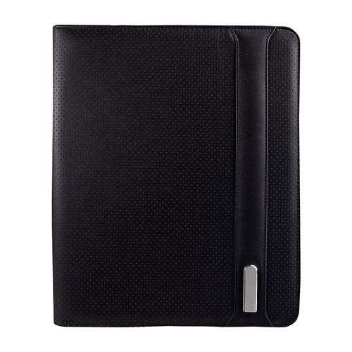 Folder with a metal clasp and nameplate. Includes an A4 ruled pad with 20 sheets. Includes a pen loop and a compartment for a smartphone and cards. Pen not included.