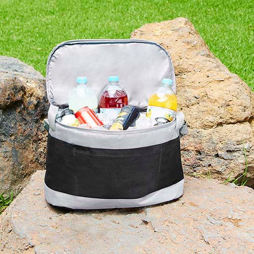 Waterproof laminated interior. Zippered main bag with front pocket. Includes handle and adjustable strap. Holds 26 cans.