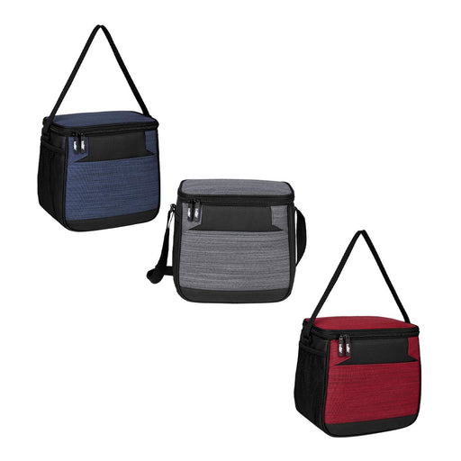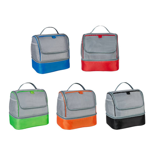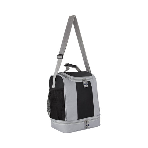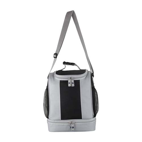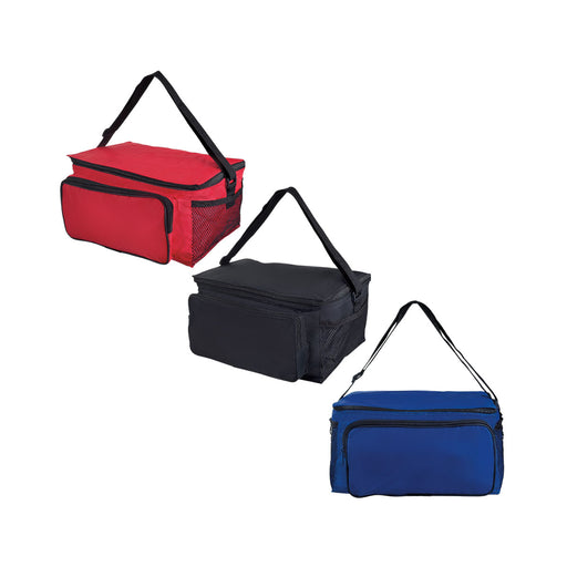 Description and characteristics Plastic-coated interior. Double zippered compartment. Mesh side pocket and top grab handle. Holds 9 cans. Basi...