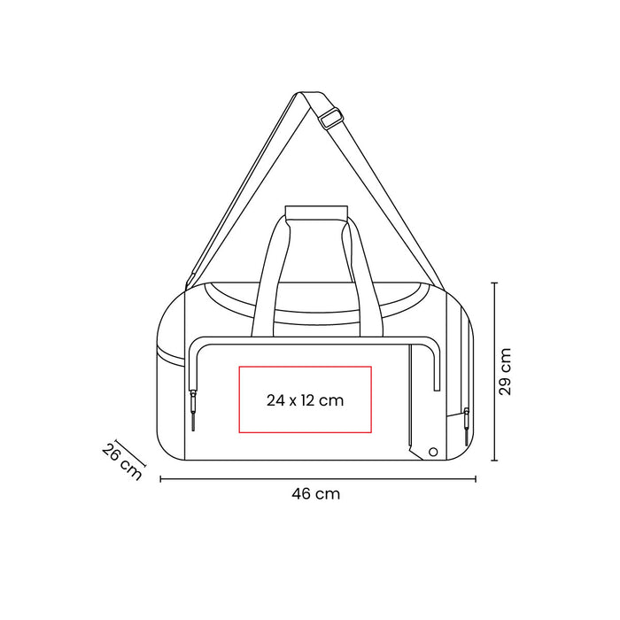 Main and front zippered pockets. Includes a mesh side pocket, a zippered side pocket, handles, and an adjustable shoulder strap.