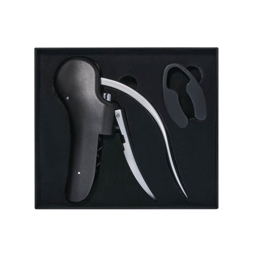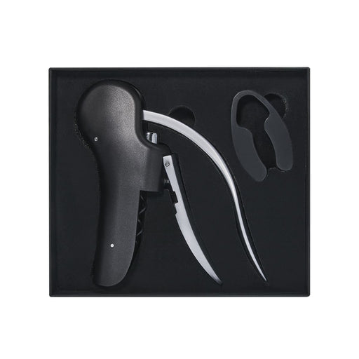 Description and characteristics Includes a corkscrew with a blade and bottle opener, stopper, nozzle, ring, and a case with space to store a bott...
