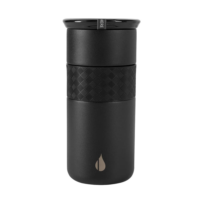 TrueBarrier™ technology uses triple-wall insulation. Double-walled stainless steel with a copper lining. Vacuum-sealed. BPA-free. Ceramic lid with safety stopper, its shape prevents spills and burns while drinking. Non-slip textured silicone band. Cup holder compatible. Non-slip base. Keeps hot for approximately 6 hours and cold for approximately 18 hours. Includes individual packaging.